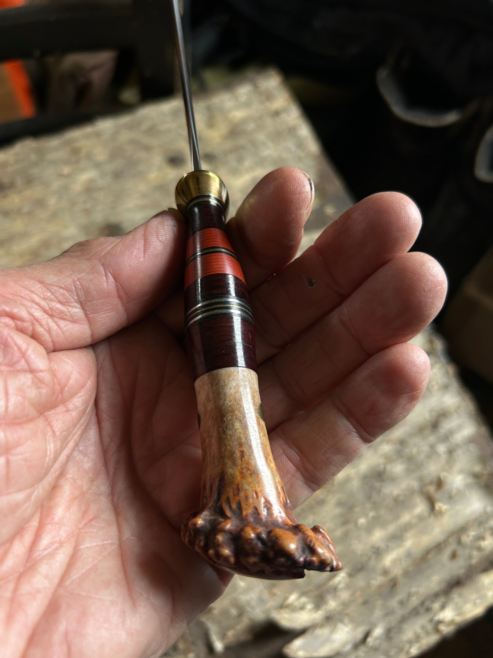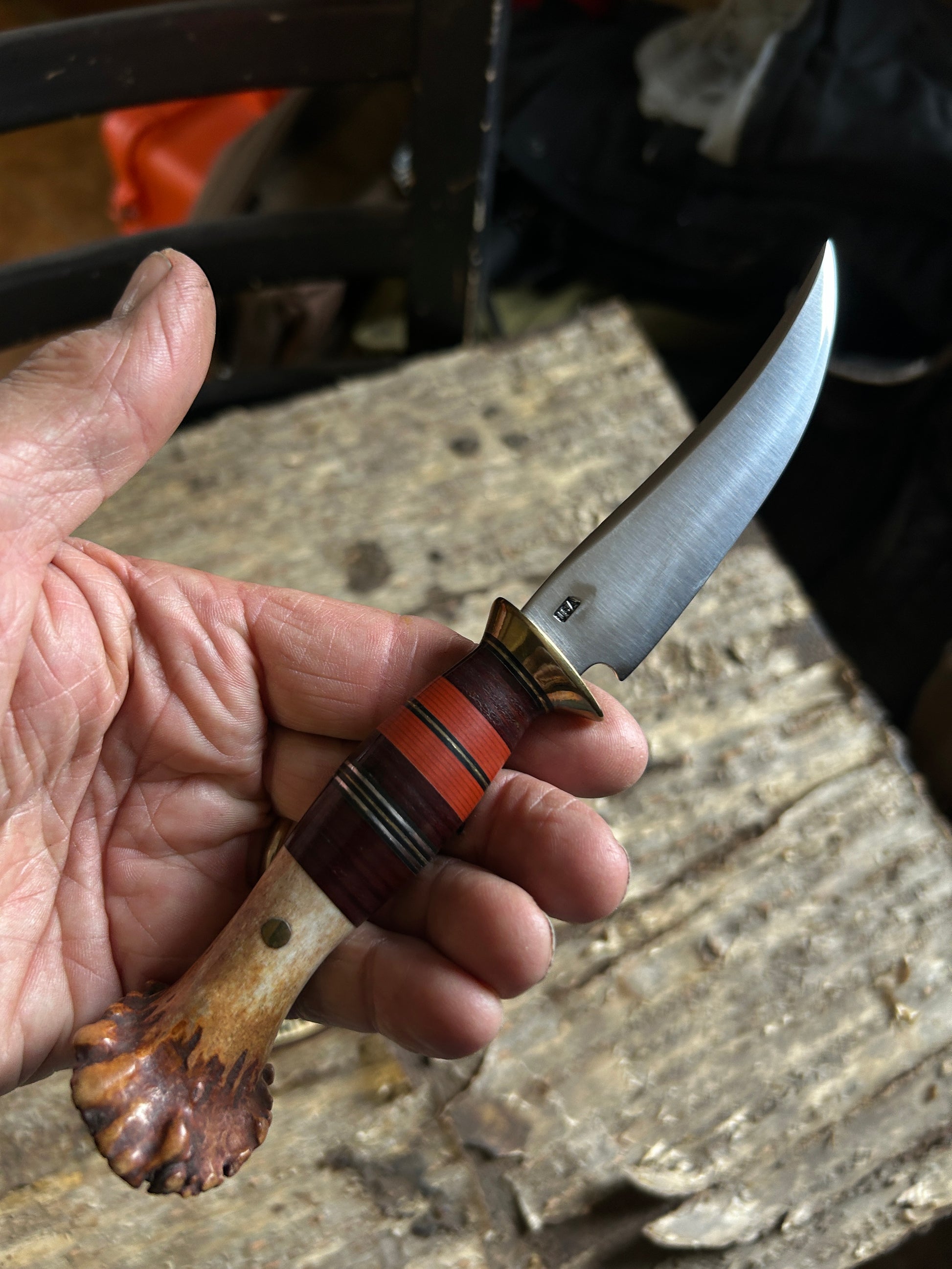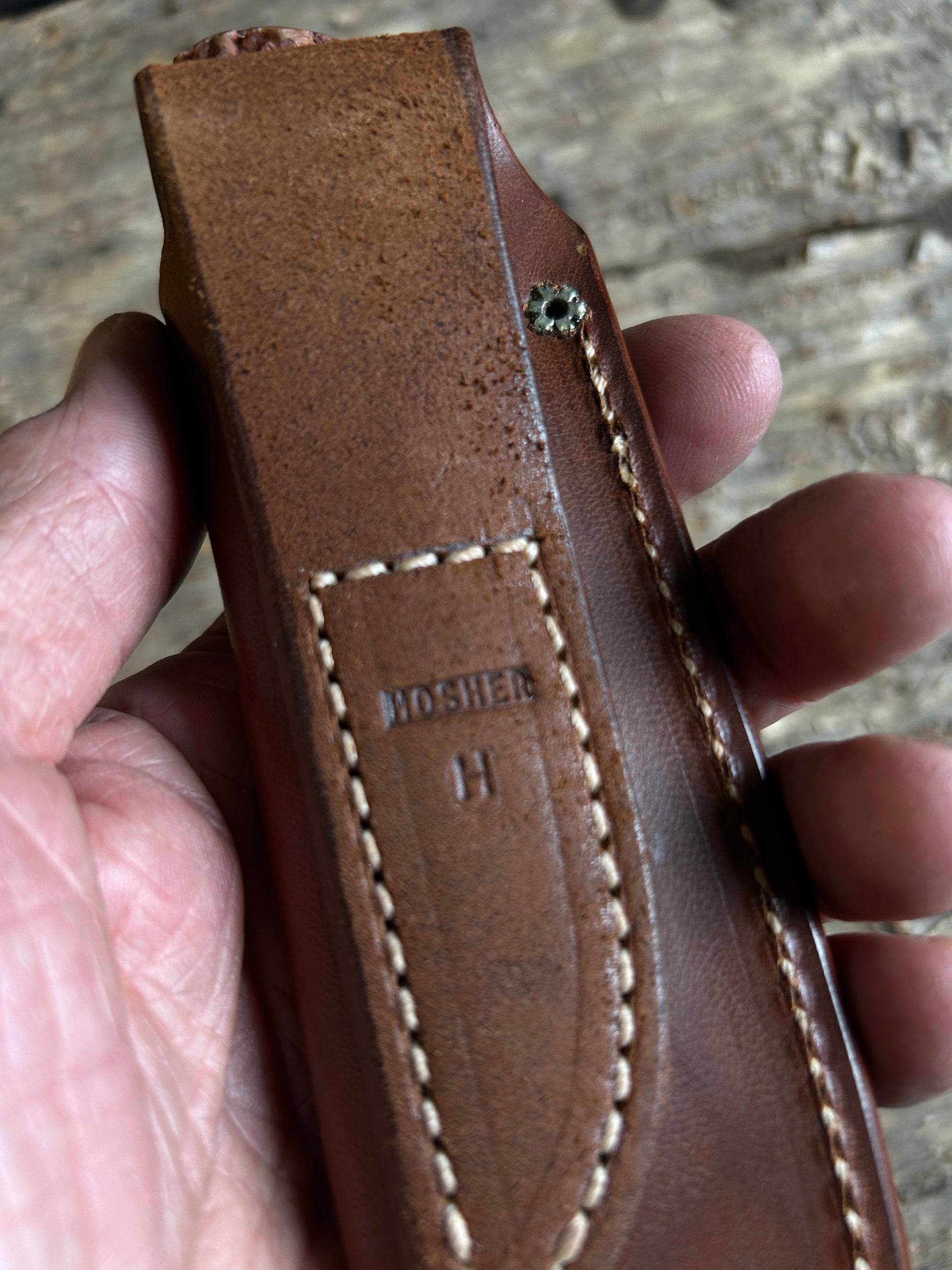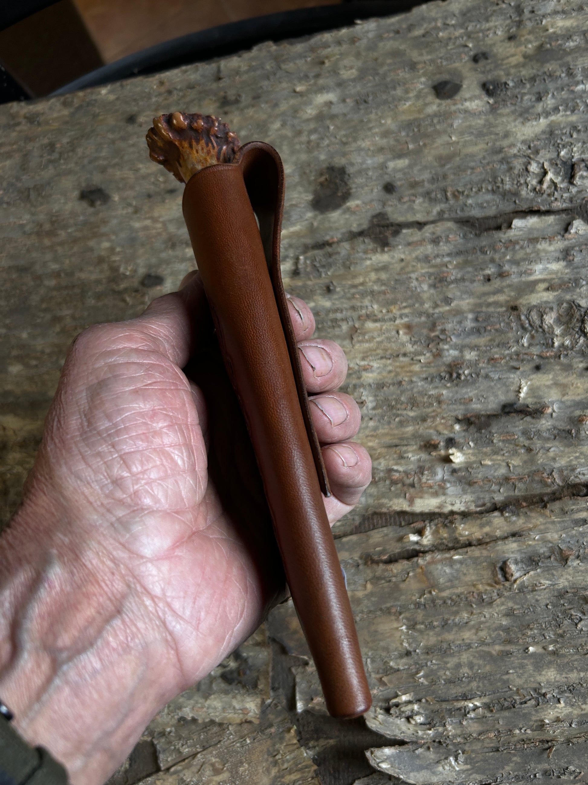 This Vintage Treeman Trout & Bird has a 4" hand forged O1 blade with a convex grind. Old Treeman stamp with USA on the back side so made around 2004 vintage. Swelled handle of horse hide with a old school spacer pattern. Silver soldered brass guard . Whitetail crown stag . OAL about 8". Comes with a floral horse hide pouch sheath. Great little knife and about 20 years old. Thanks, Jim