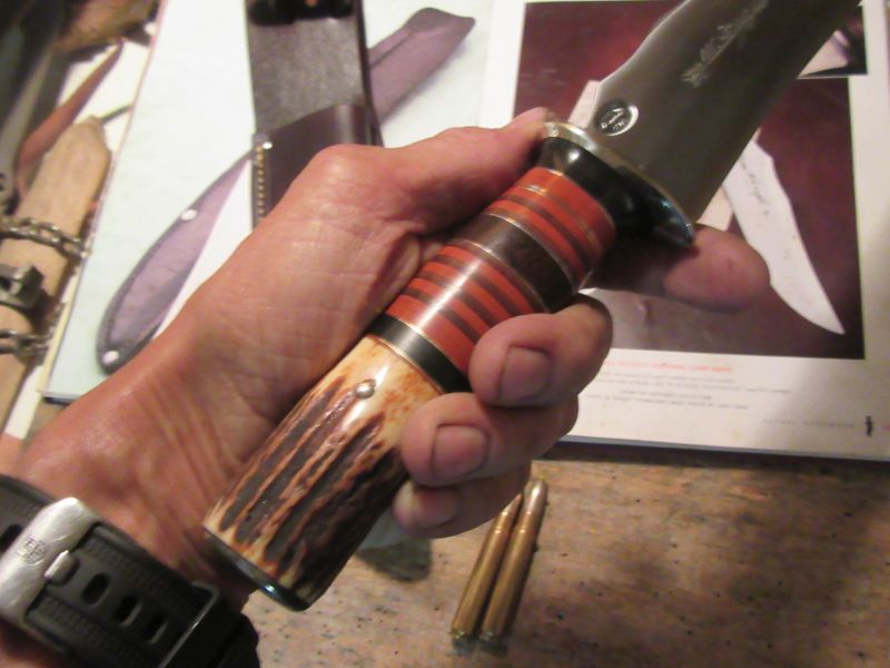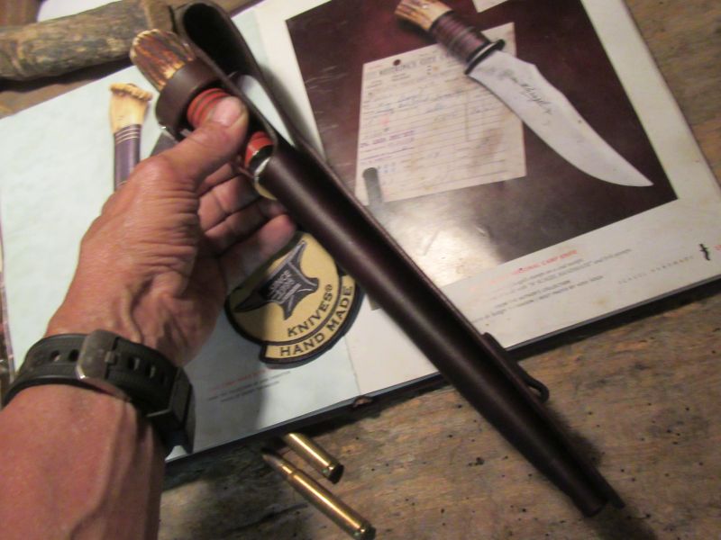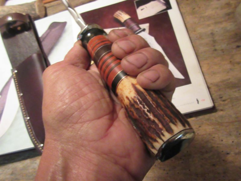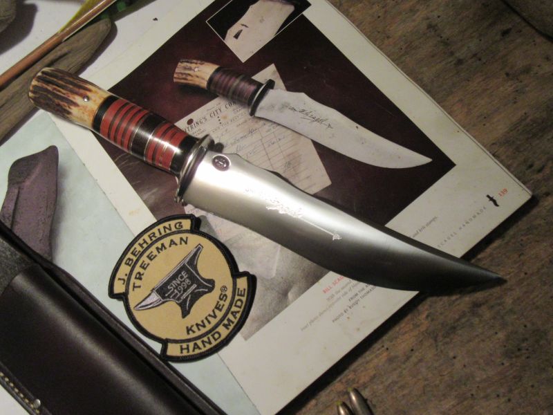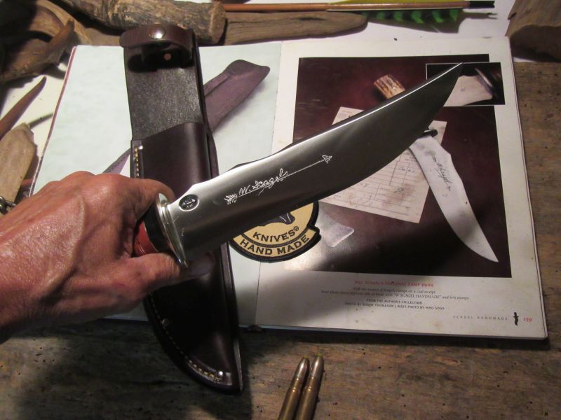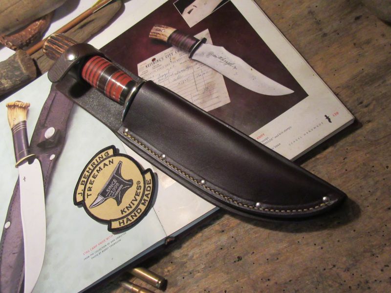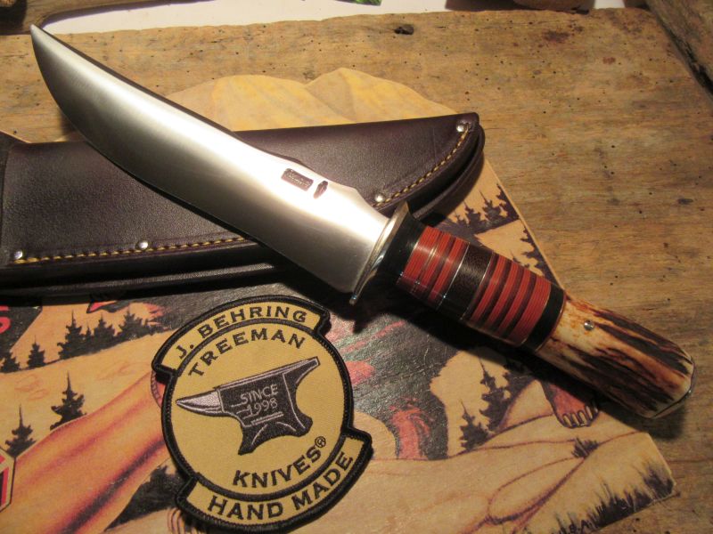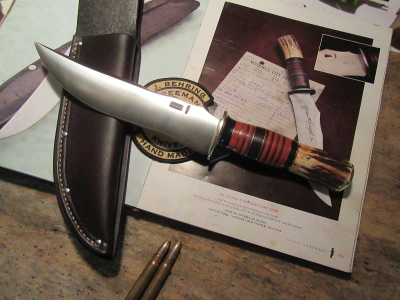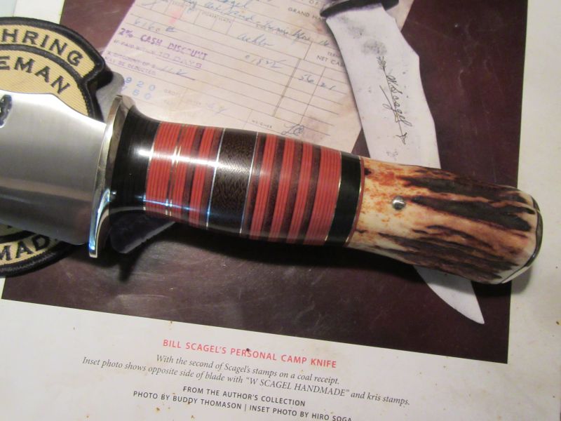Order only! Most orders take 2 to 6 weeks to completion .This Treeman Replica of W. Scagel personal camp knife has about an 8" blade with a convex grind. Nice deep stamps and a nickel guard. Stacked fiber and leather along with a butt cap to finish it off. Referenced from Scagel Hardcover Book Page 139. Thanks, Jim
